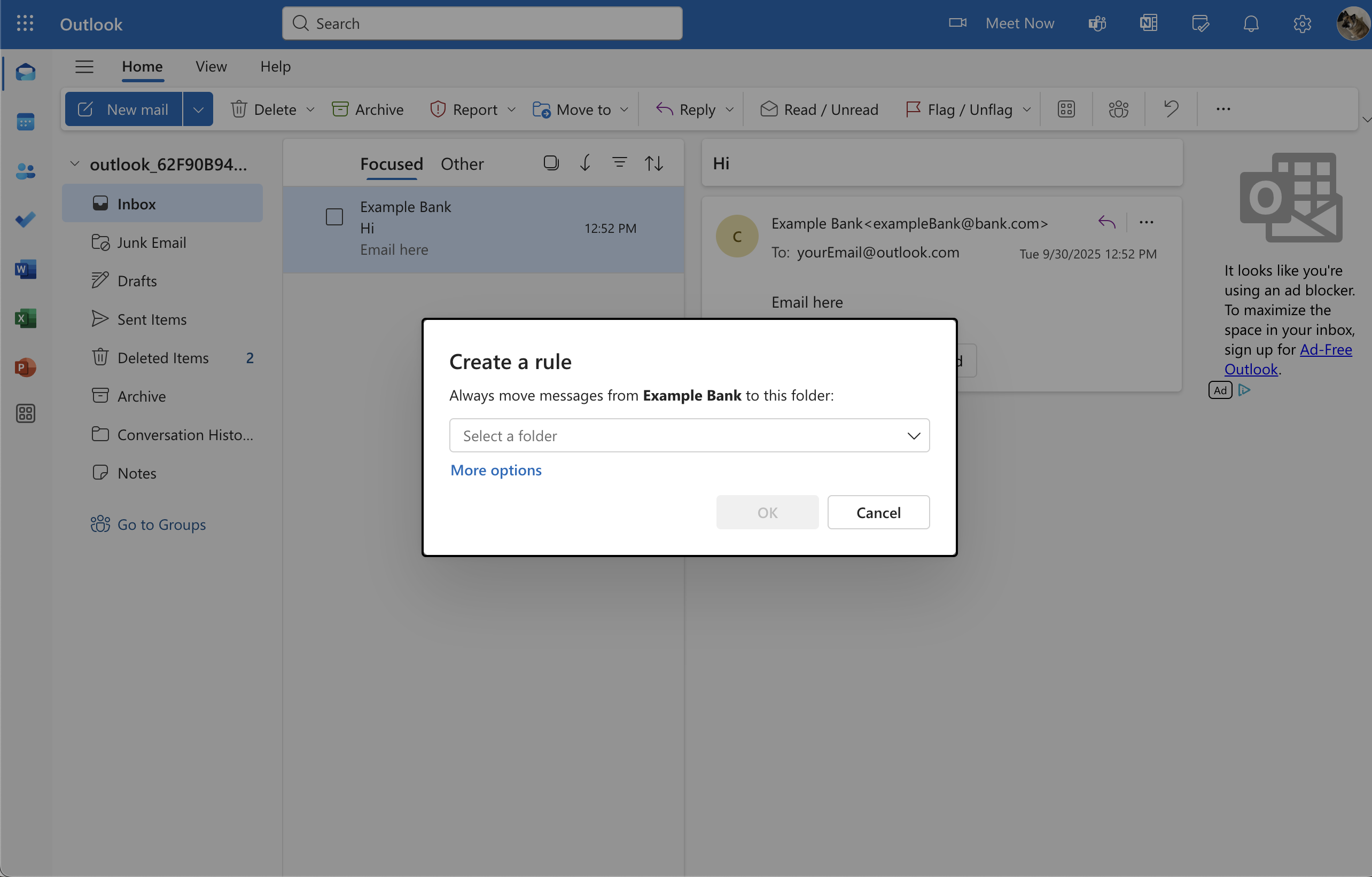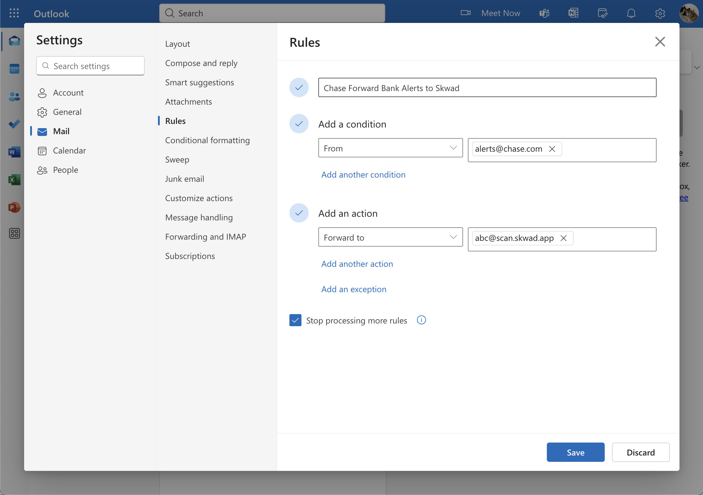 Automatically forward your bank alerts from Outlook to Skwad to sync transactions and balances instantly.