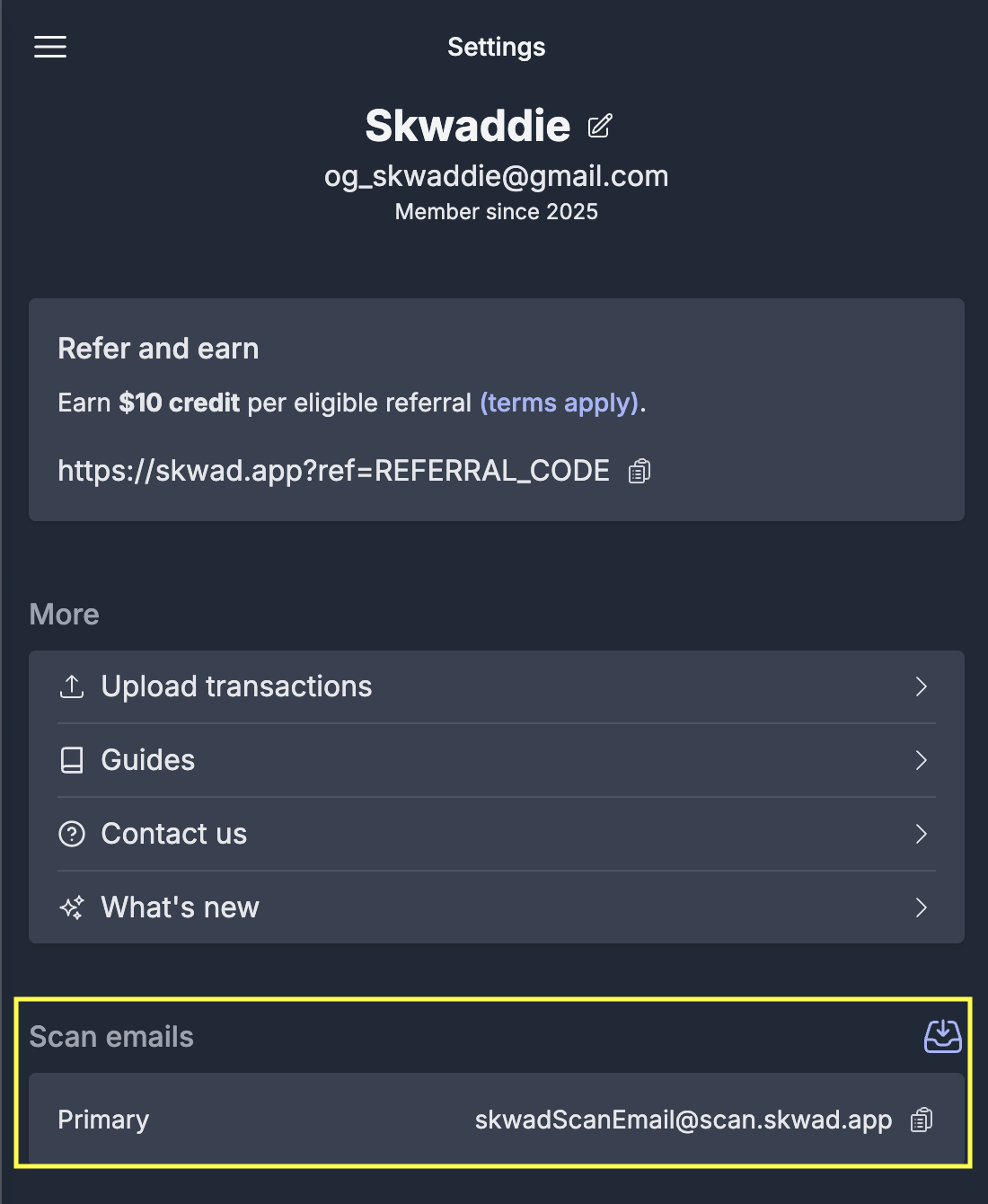 - Get Your Unique Address: Every Skwad user receives their own personalized scan email address (e.g.,